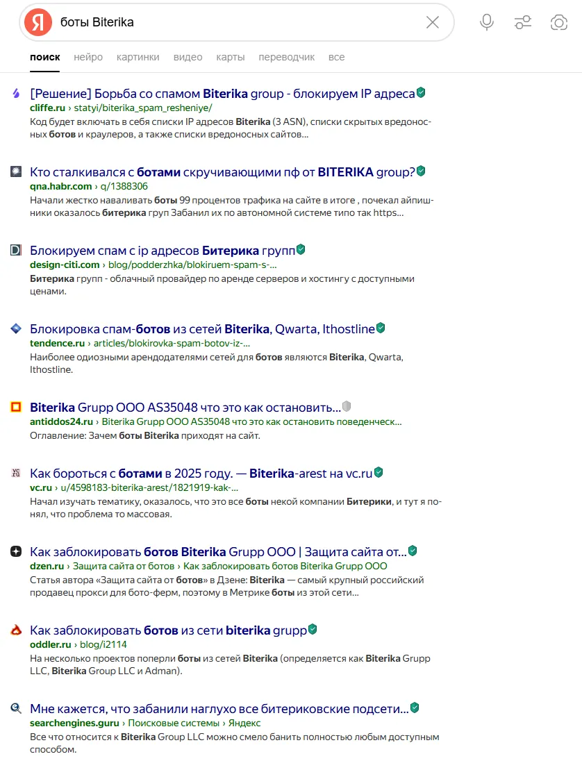 И таких ботов действительно много — о них уже написано немало статей. Особенно часто упоминаются боты от ООО Biterika Grupp (AS 35048). Они стали популярны благодаря доступным прокси-серверам, которые позволяют эффективно подменять реальные IP-адреса.